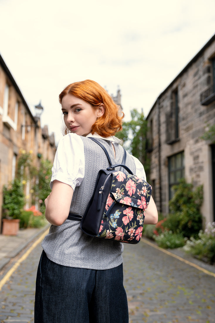 Step into crisp autumn mornings with the Midnight Floral print from Fiorelli's new autumn collection. With a deep and rich navy base, brought to life with soft dusky pink and cornflower blue autumn blooms. Each piece in the collection carries a little bit of this autumn charm.