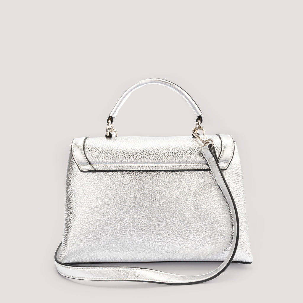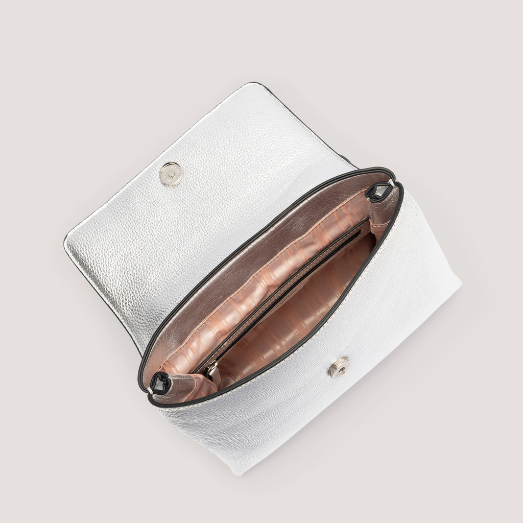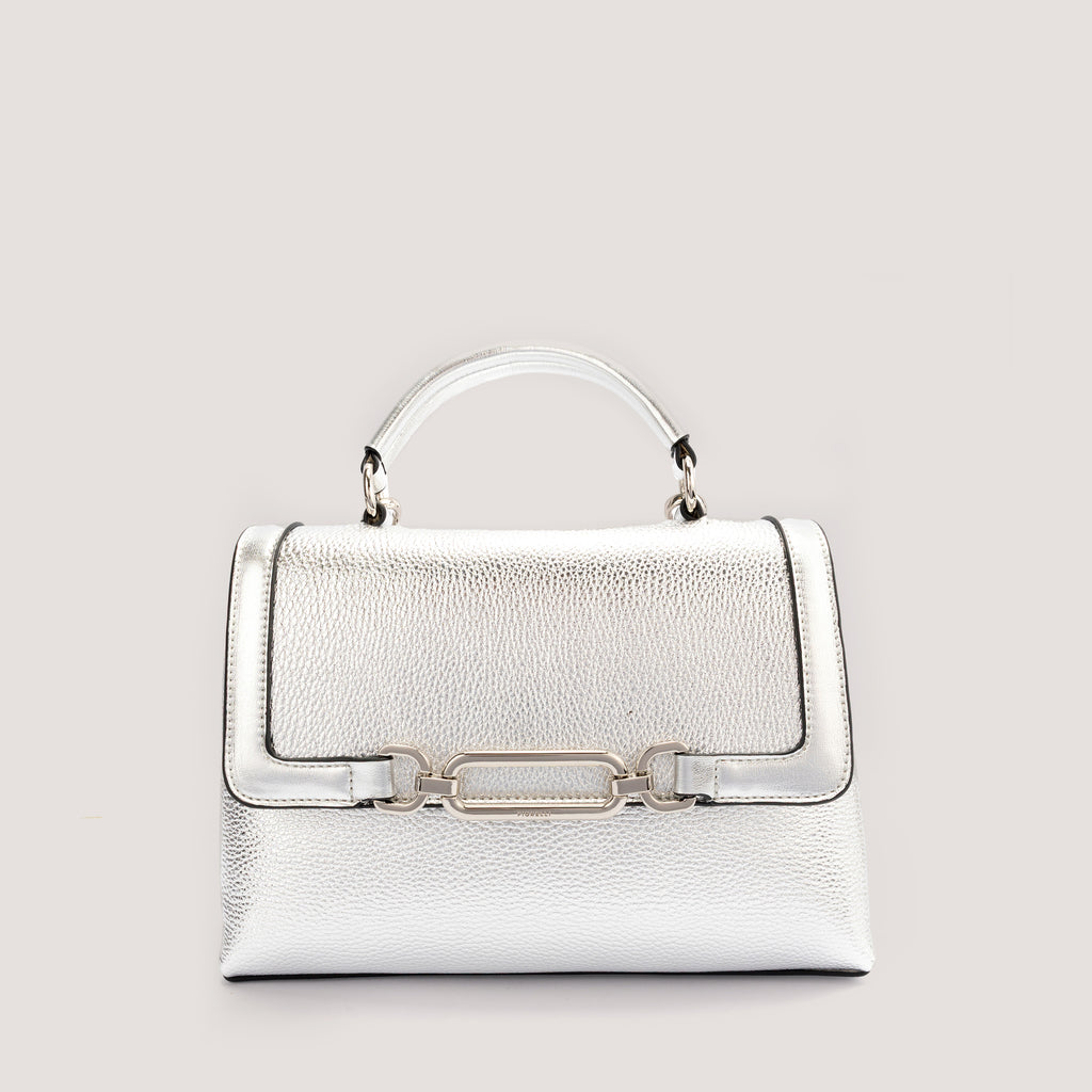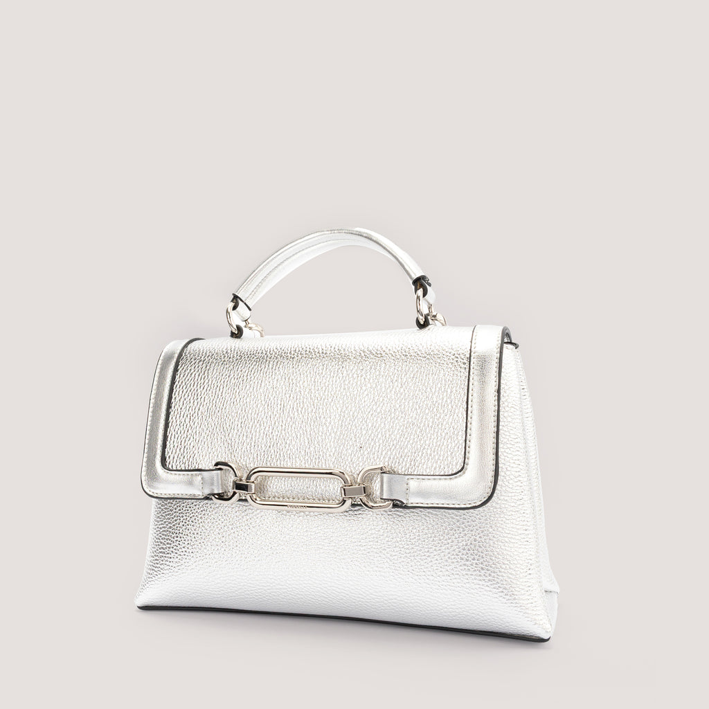Equal parts contemporary and timeless, the Emilia bag channels a modern elegance. Offered in silver metallic, it is crafted from premium faux leather and designed with a secure zip and a silver-tone chain-link detail. Carry it by the top handle or attach the adjustable strap to style it as a crossbody.
