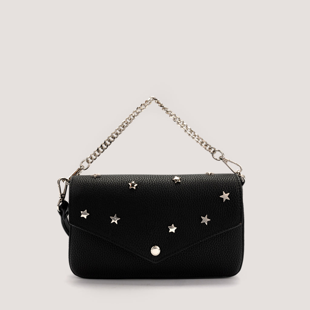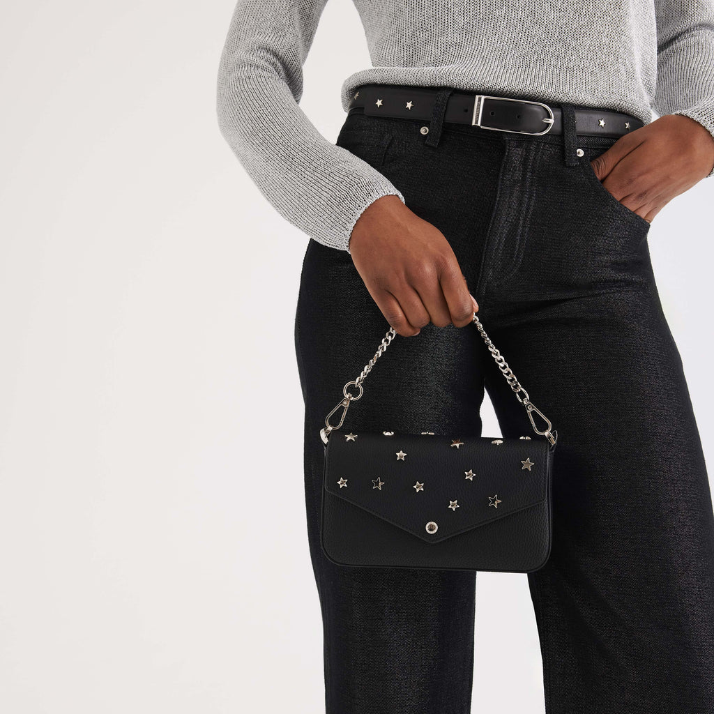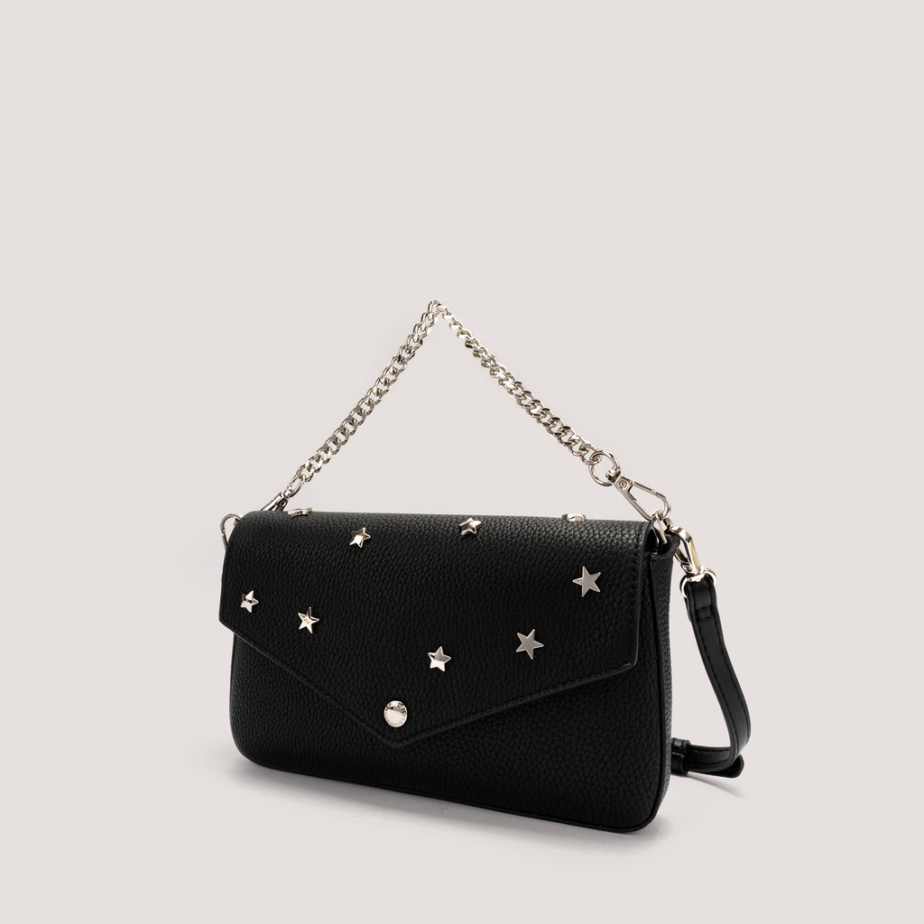 The Lacey bag is as suited to special occasions as it is evening soirées. Accented with silver star studs detailing, and crafted from premium black faux leather and features a slip pocket inside for small essentials. Wear it across the body, carry it by the chain handle or detach both straps to style it as a clutch.