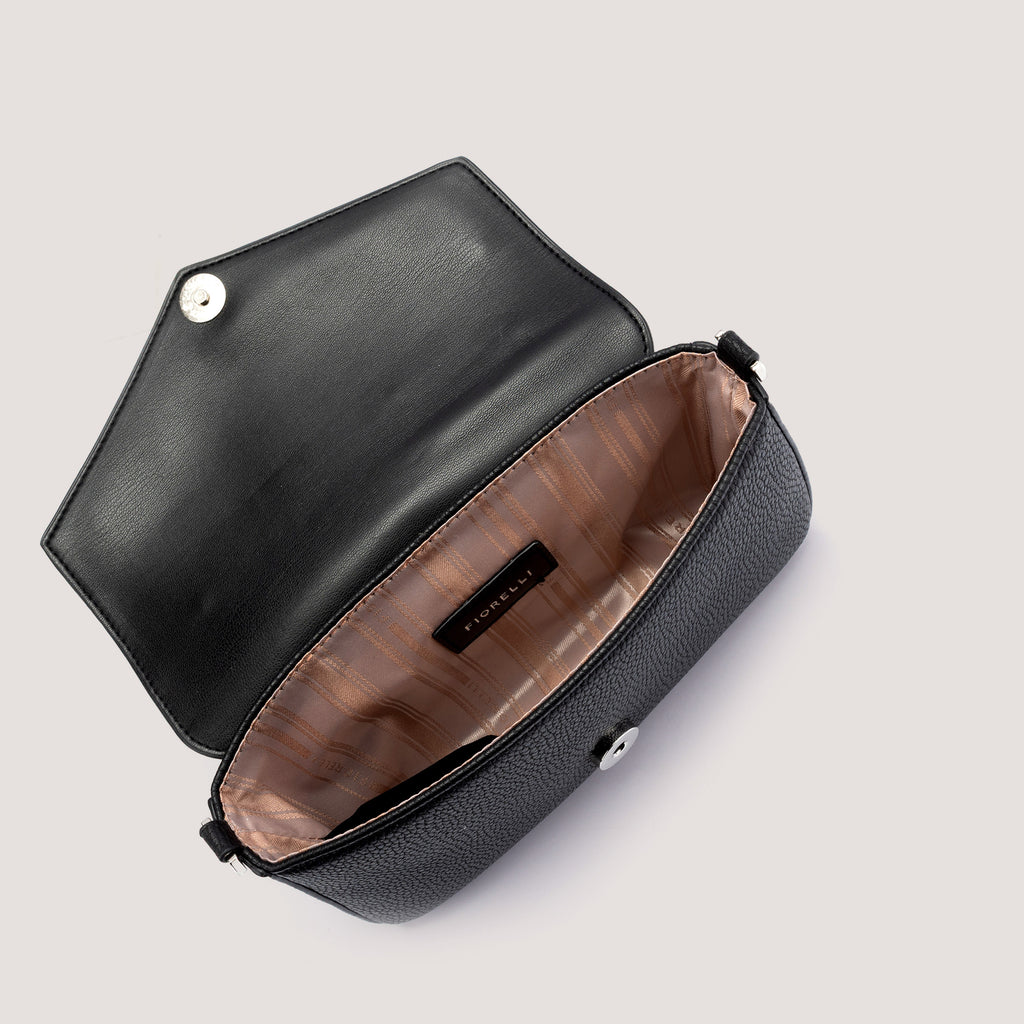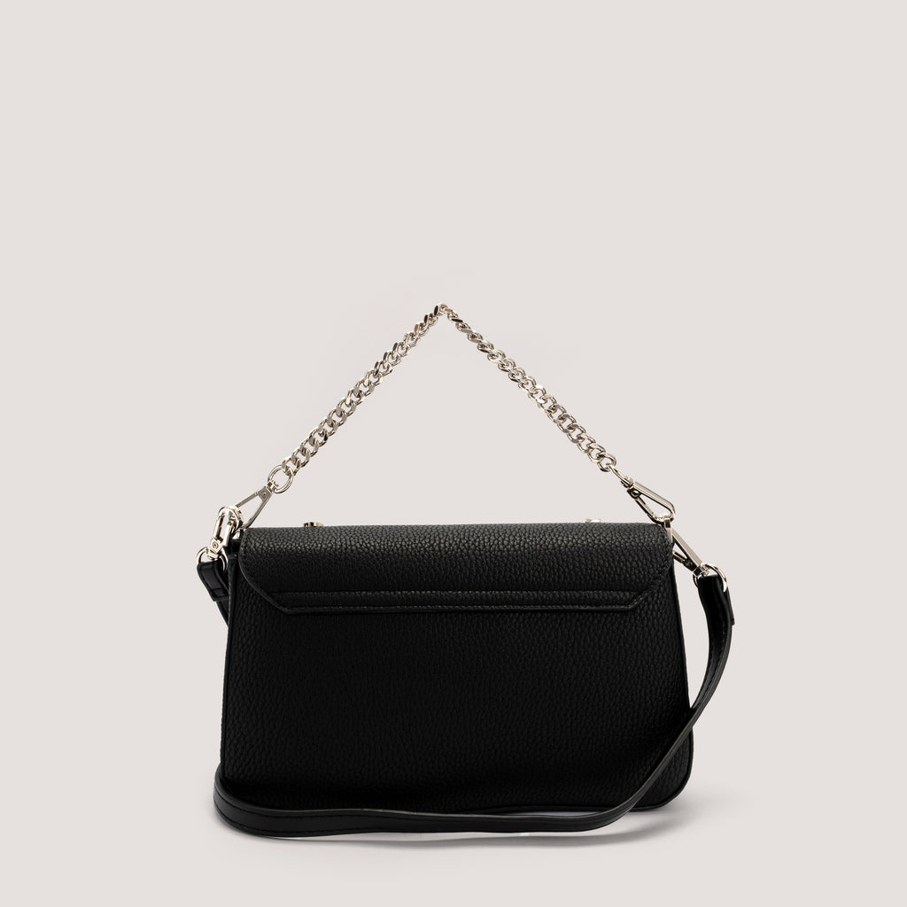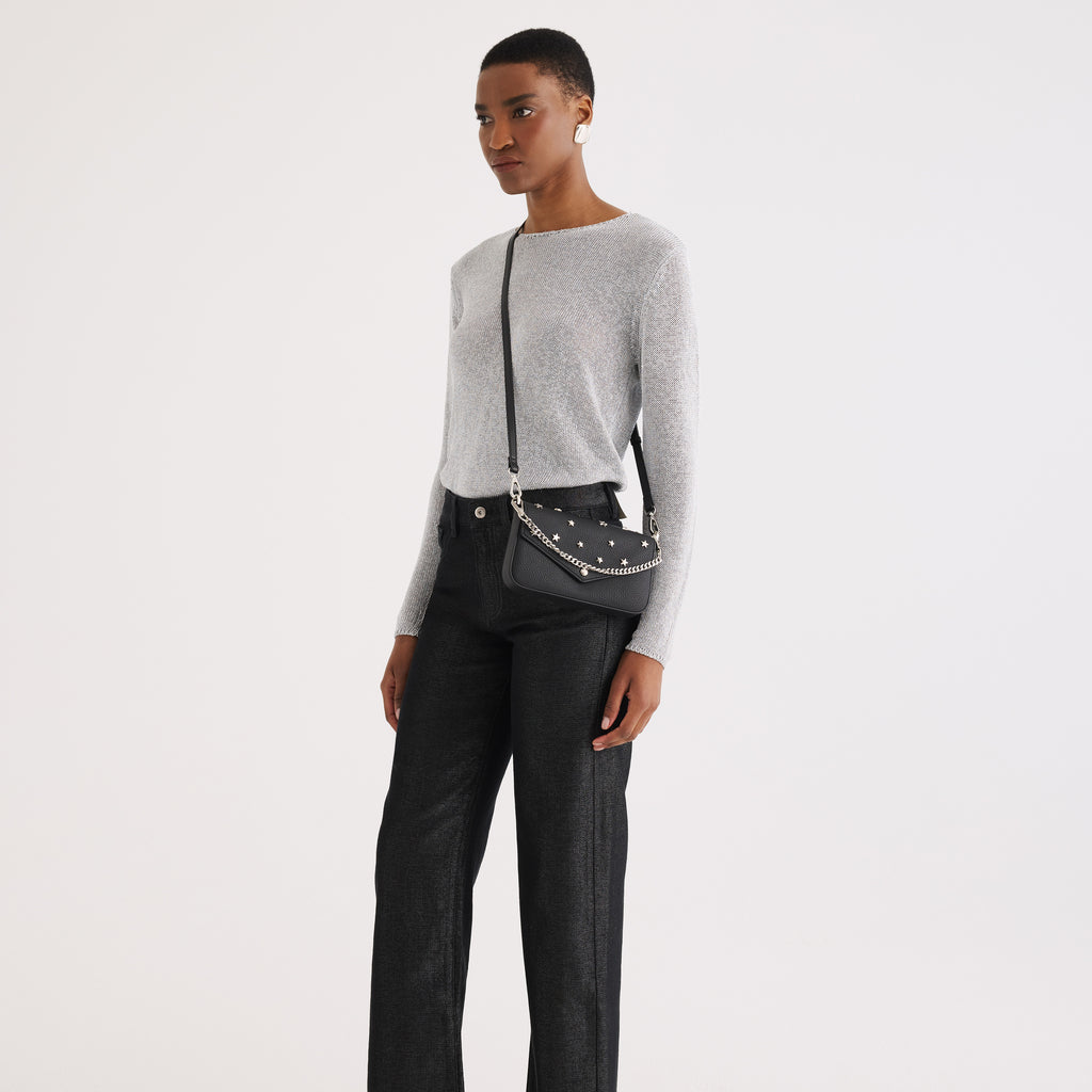 The Lacey bag is as suited to special occasions as it is evening soirées. Accented with silver star studs detailing, and crafted from premium black faux leather and features a slip pocket inside for small essentials. Wear it across the body, carry it by the chain handle or detach both straps to style it as a clutch.